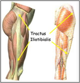 De tractus iliotibialis is een peesblad dat aan de buitenkant van je bovenbeen loopt. Het is een brede platte pees die bovenaan je heupbeen hecht en van daaruit langs de buitenkant van je heup/bovenbeen over de knie loopt richting buitenkant onderbeen, waar hij net onder he kniegewricht aanhecht. De pees is, aangestuurd door o.a. je bilspieren en de tensor facialatae (een spier gelegen aan de voorkant van je heup) medeverantwoordelijk voor de stabilisatie van je knie en heup.Het peesblad loopt over het kniegewricht en glijdt tijdens het bewegen van de knie als het ware over het kniegewricht. Hierbij beweegt de buitenste verdikking van het gewricht, een botstuk van je bovenbeen (ter hoogte van het zwarte pijltje) aan de binnenkant langs de pees. Dit geeft wrijving (frictie). In sommige gevallen geeft deze, overigens natuurlijk frictie klachten. De frictie is het grootst wanneer de knie in een hoek van ongeveer 30 graden komt. Dit verklaart de pijn tijdens het traplopen. De blessure kent vele oorzaken, maar kenmerkt zich door een felle stekende pijn aan de buitenkant van de knie. De overbelasting, ontstaan door een van de later te noemen oorzaken, bestaat uit een irritatie van het frictievlak. Bij deze irritatie ontstaat een zwelling, waardoor de klacht soms plotseling toeneemt (‘ik kon ineens niet meer lopen’.) In deze situatie is trainen bijna onmogelijk en sterk af te raden. Door trainen betekent dat de klacht toeneemt.Mogelijke oorzaken.